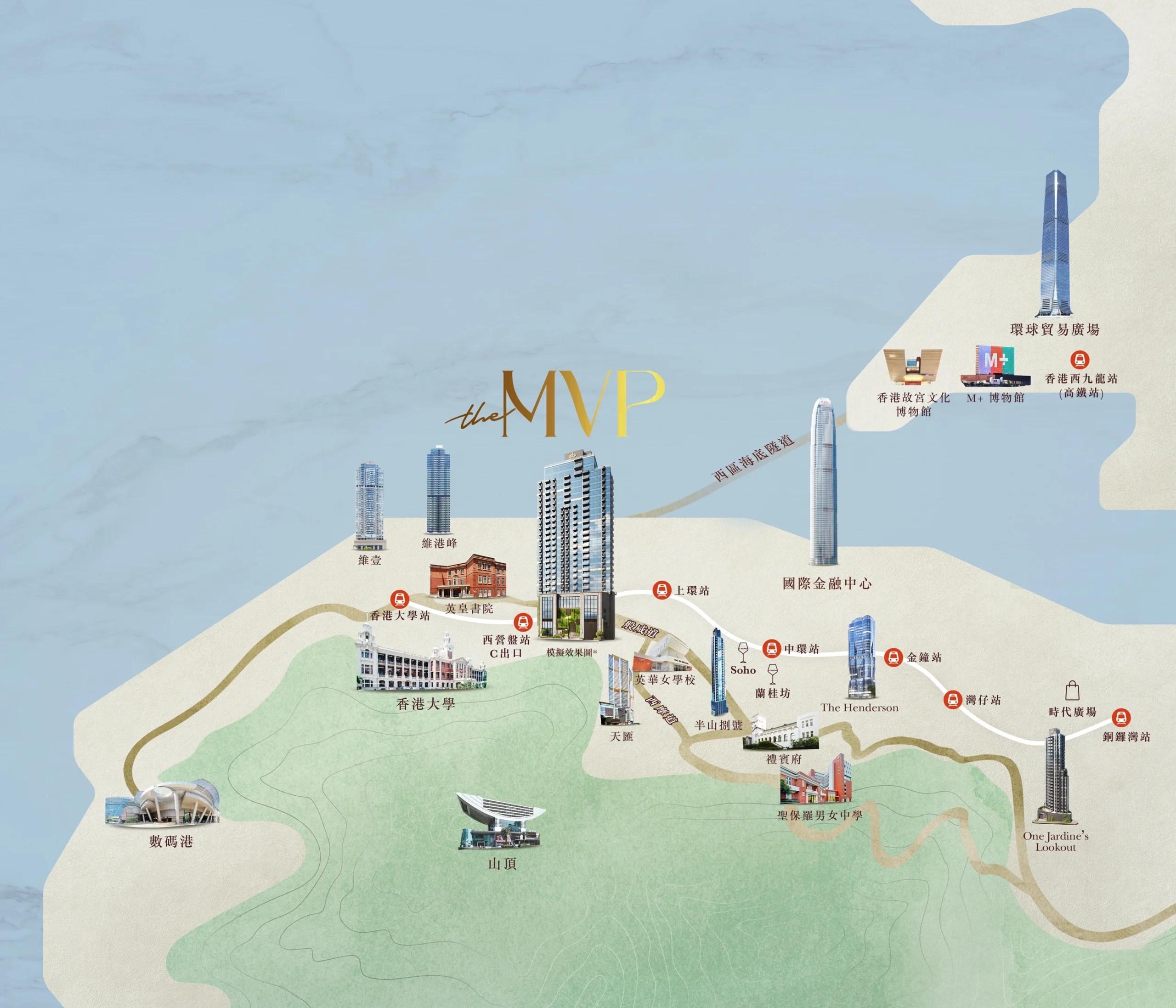 區域:半山區西部|發展項目的街道名稱及門牌號數:般咸道28號*(*上述臨時門牌號數有待發展項目建成時確認。)|賣方為施行《一手住宅物業銷售條例》第二部而就發展項目指定的互聯網網站的網址:www.theMVP.hk|本廣告/宣傳資料內載列的相片、圖像、繪圖或素描顯示純屬畫家對有關發展項目之想像。有關相片、圖像、繪圖或素描並非按照比例繪畫及/或可能經過電腦修飾處理。準買家如欲了解發展項目的詳情,請參閱售樓說明書。賣方亦建議準買家到有關發展地盤作實地考察,以對該發展地盤、其周邊地區環境及附近的公共設施有較佳了解。